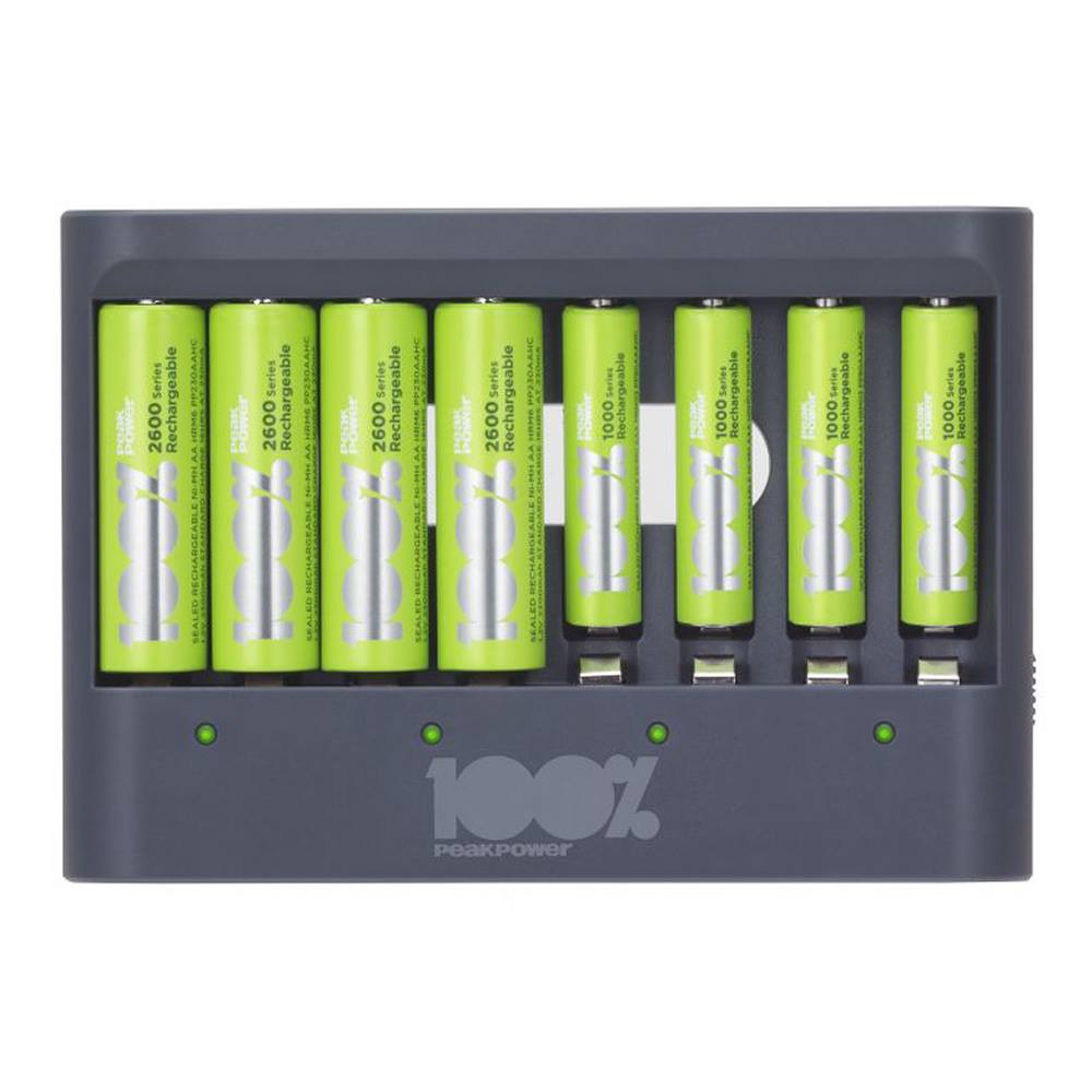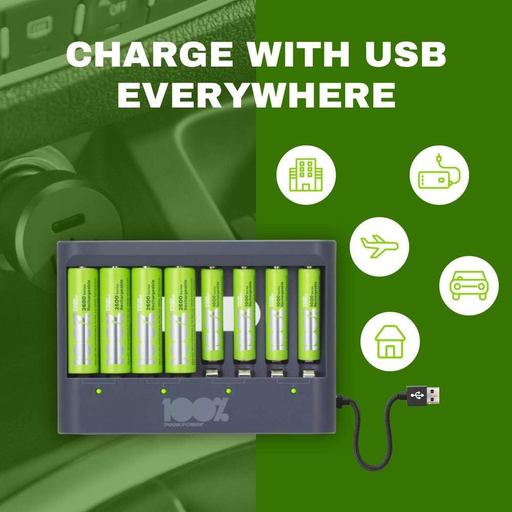 100% PeakPower Cargador de Pilas AAA y AA Super Rápido 2-6 Horas – Incluye 8 Pilas Recargables AA de 2300 mAh, 4 Pilas Recargables AAA 800 mAh, 2 ada