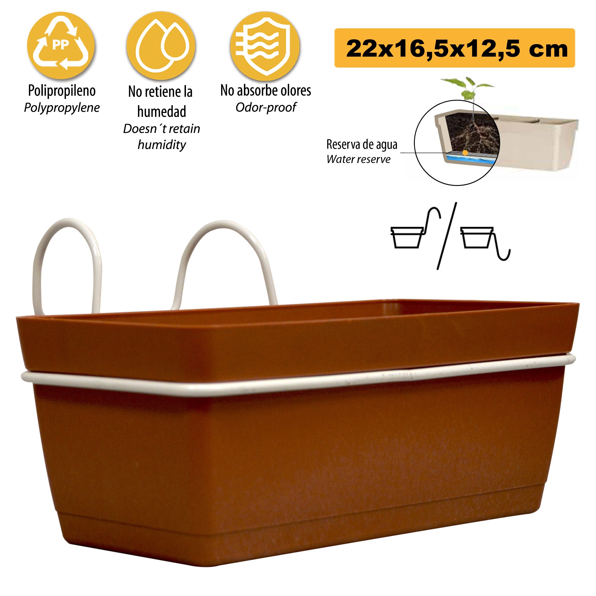 3 jardineras l 22 cm con ganchos, de polipropileno terracota