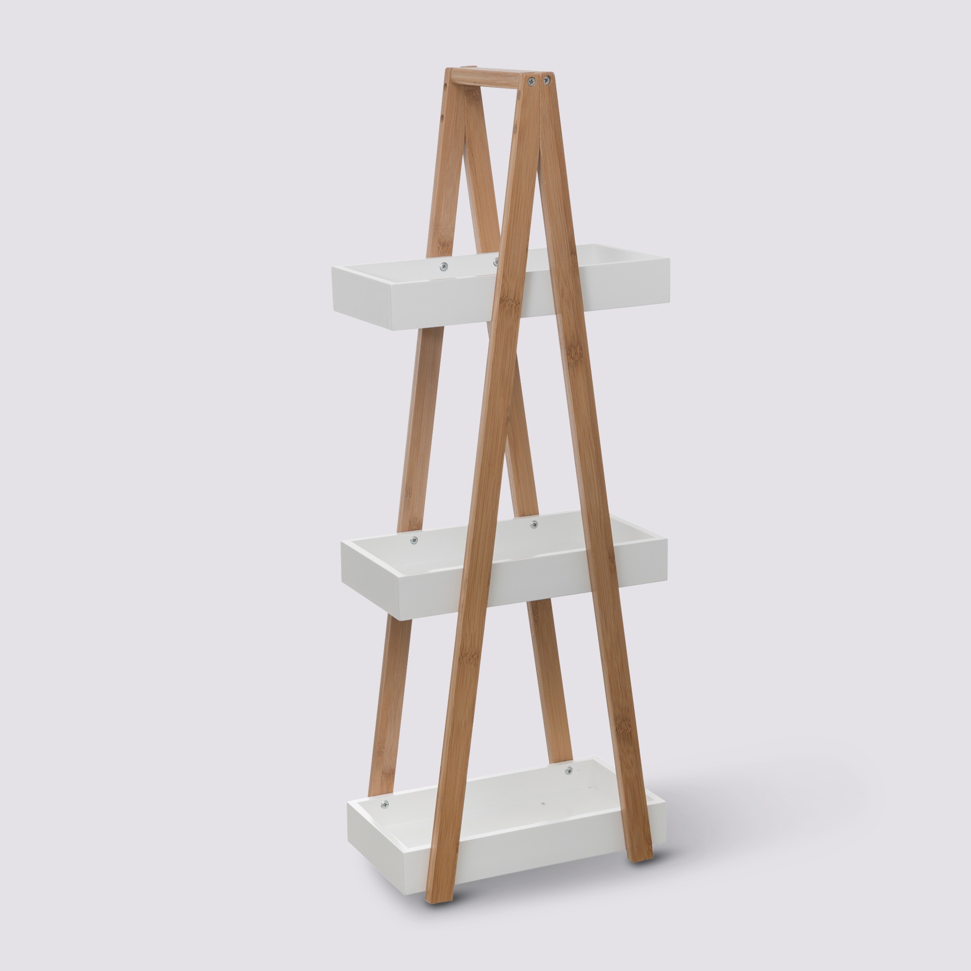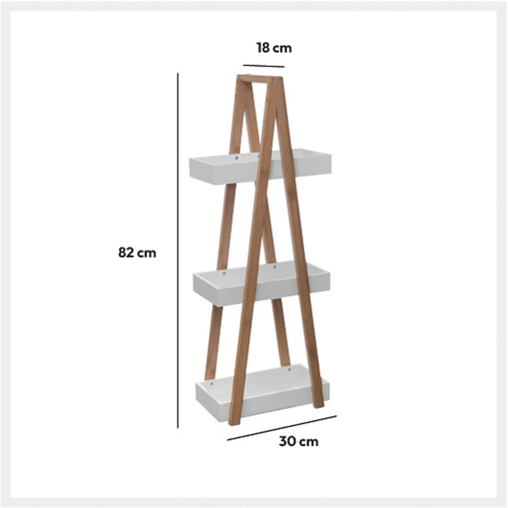 Estantería baño fabricada en bambú con tres estantes MDF blanca, ideal para almacenar y organizar los productos de maquillaje, cremas corporales y demás productos de higiene íntima.