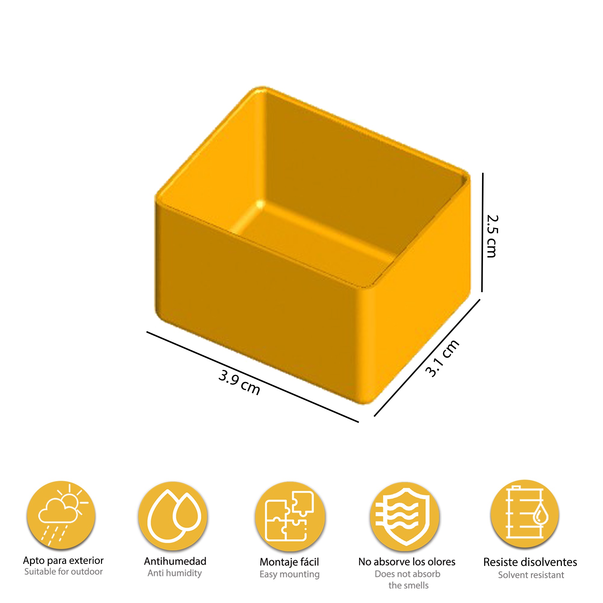 Fabricado con poliestireno antichoque y con polipropileno, resistente a la intemperie y resistente a disolventes y aceites.