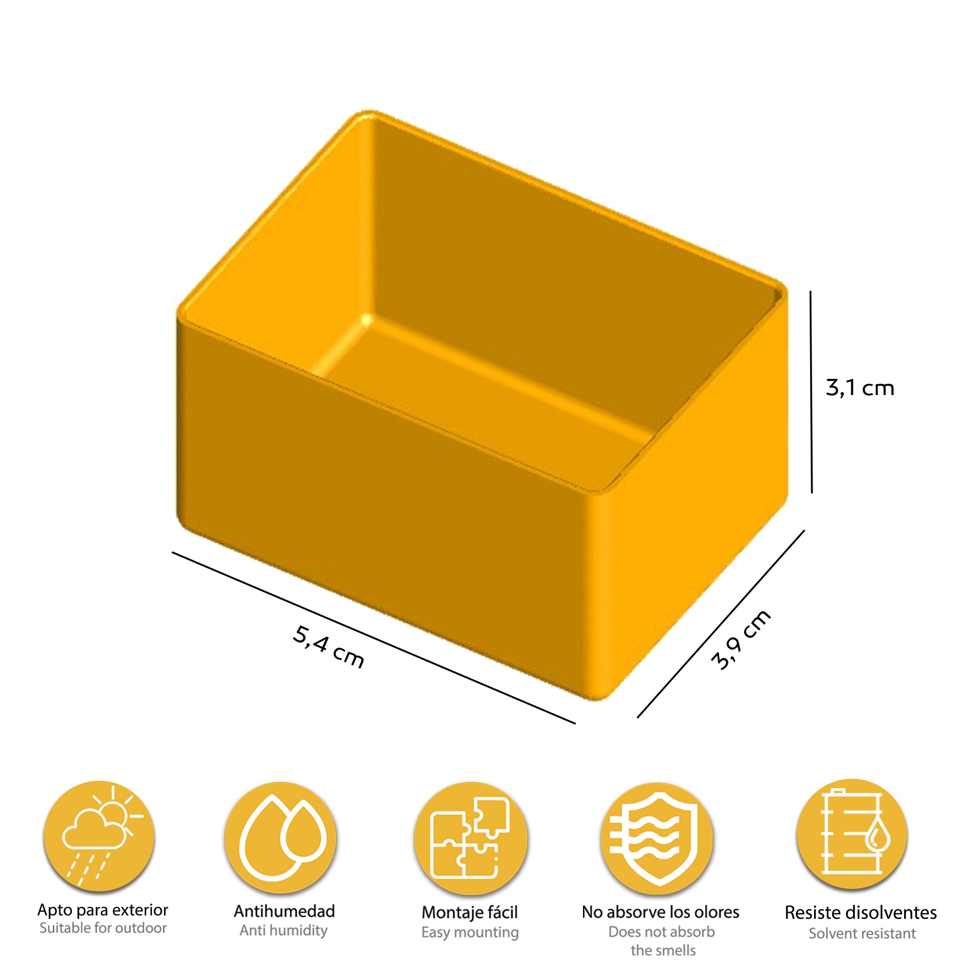 Fabricado con poliestireno antichoque y con polipropileno, resistente a la intemperie y resistente a disolventes y aceites.