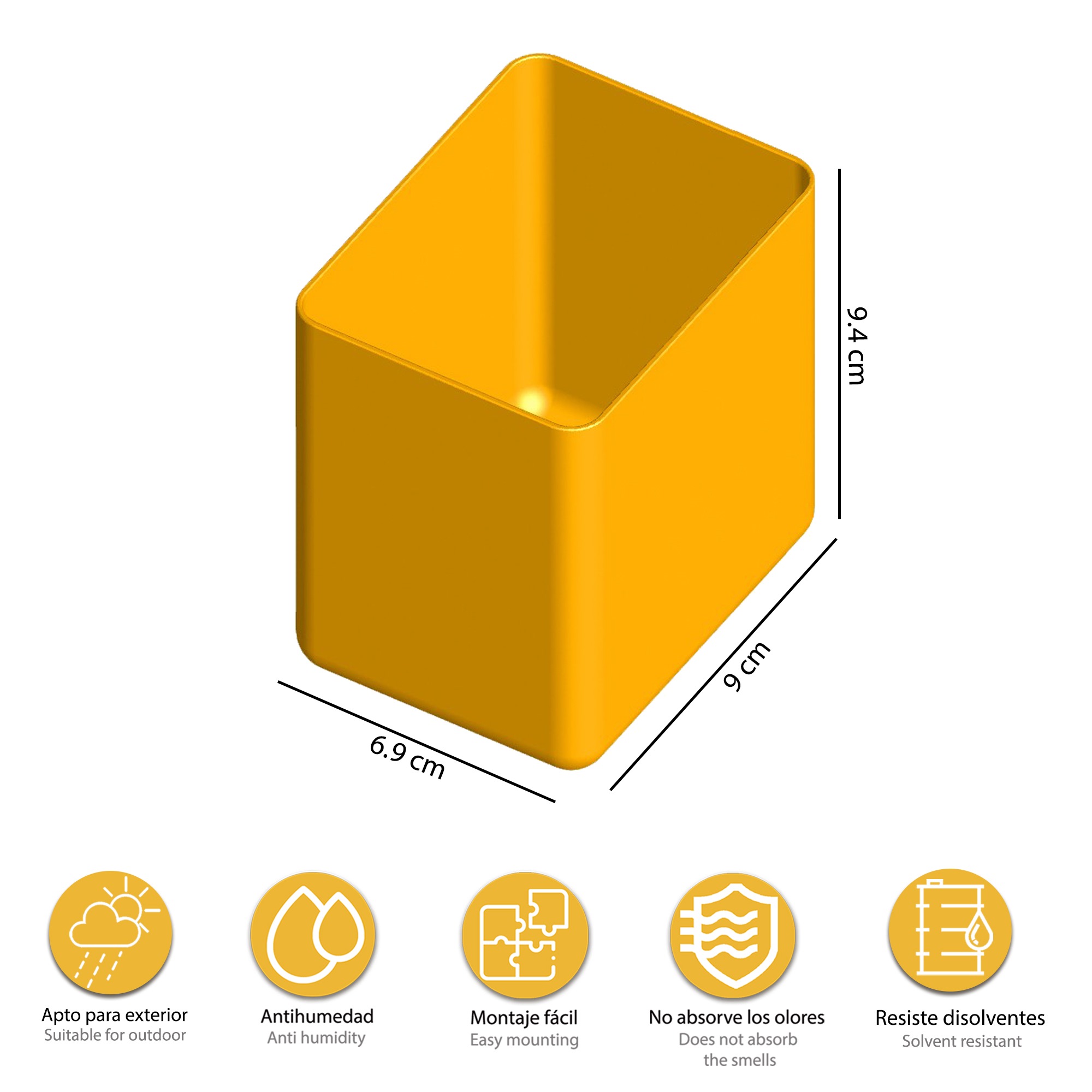 Fabricado con poliestireno antichoque y con polipropileno, resistente a la intemperie y resistente a disolventes y aceites.