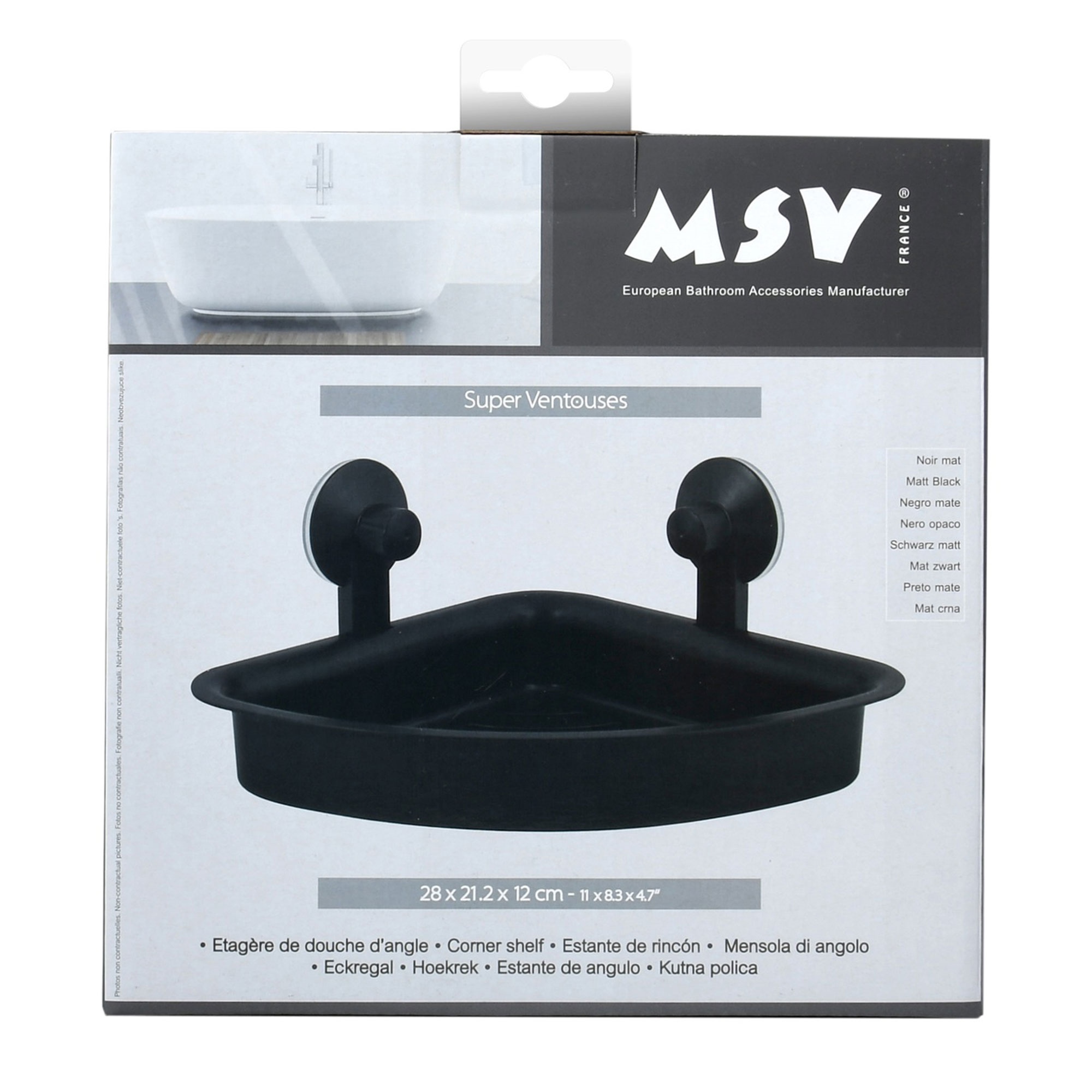 Estateria de esquina de ducha mega ventosa 2 ganchos y de facil instalacion para champú, esponjas, afeitadoras y otros accesorios de ducha. Fabricado en plastico con acabado mate de dimensiones: 28×21,2x12cm.