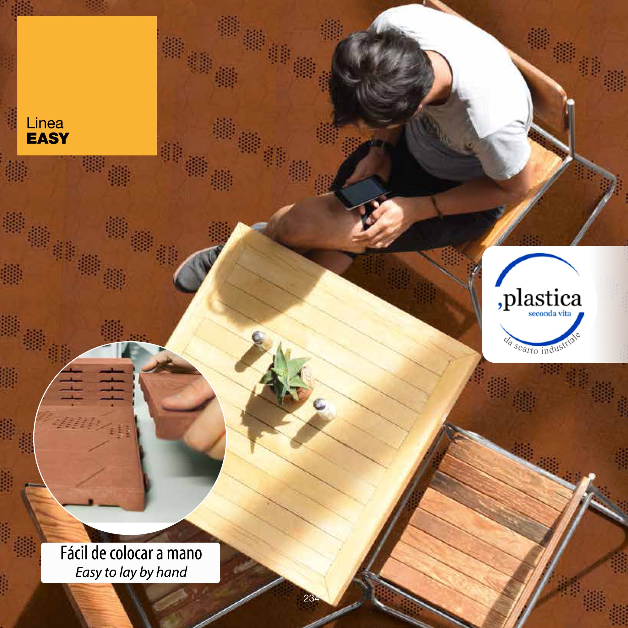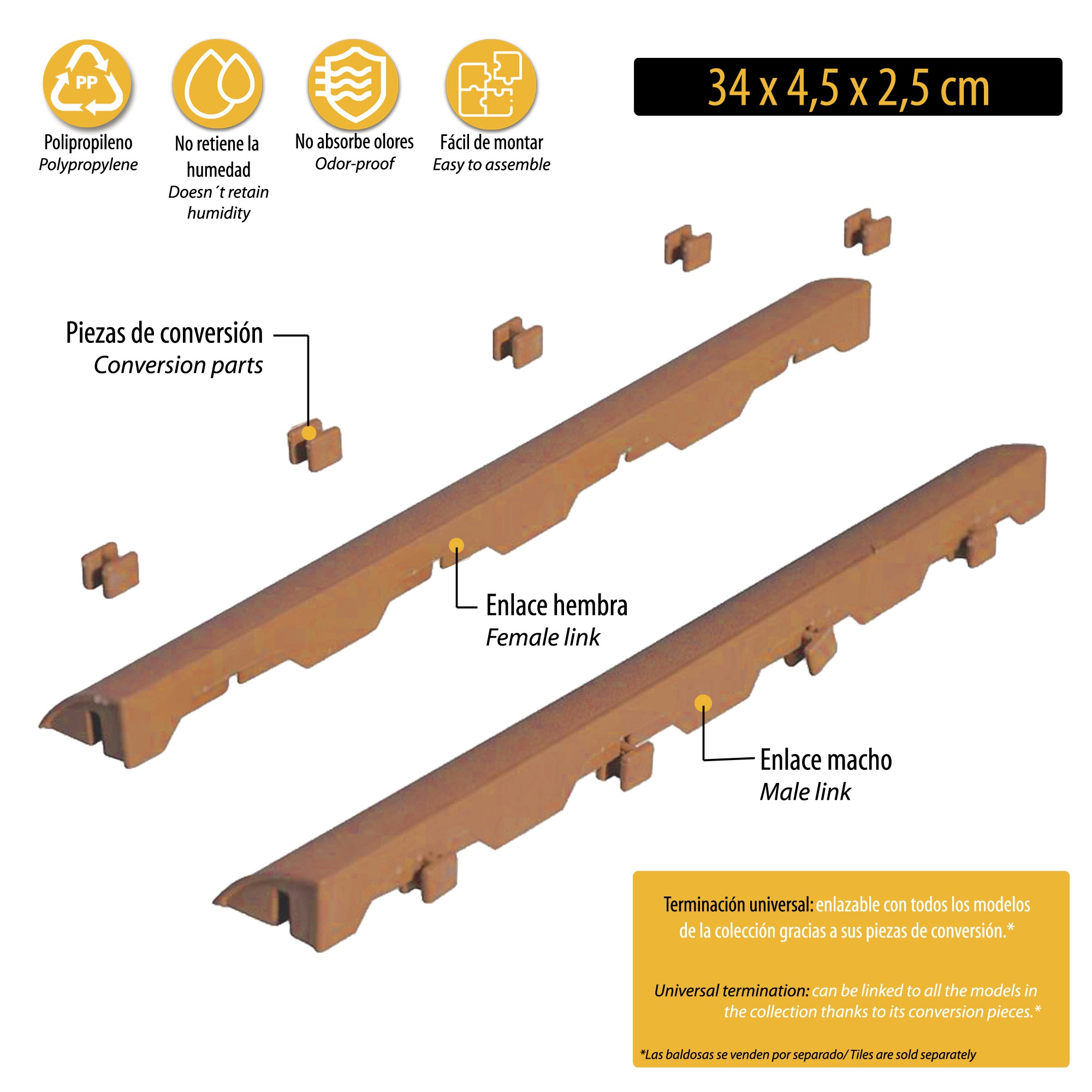 Kit 6 piezas: un único borde de acabado en polipropileno en color, con sistemas de conexión universal. Es enlazable a todos los lados de la baldosa de suelo EASY, gracias a piezas de conversión, con las que se pueden convertir los enlaces en macho o hembra (piezas incluidas).