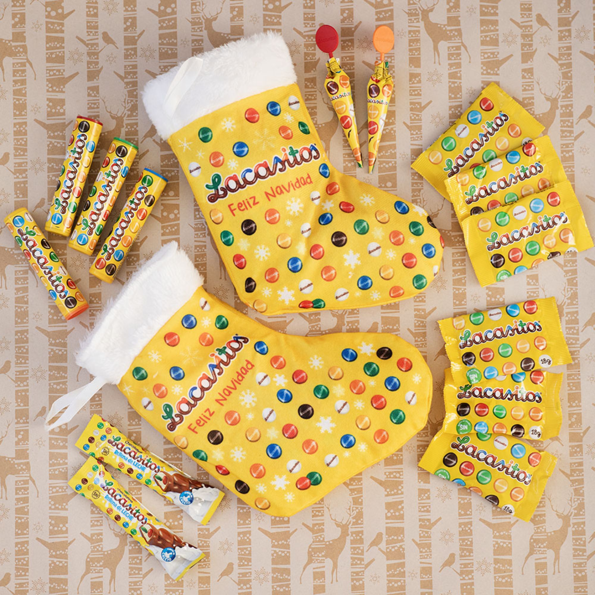 El calcetín está compuesto de: 4 Tubos de 20g de lacasitos + 2 Paraguas de chocolate con leche y lacasitos + 6 Bolsas de 18g de lacasitos + 2 Chocolatinas rellenas de leche y lacasitos
