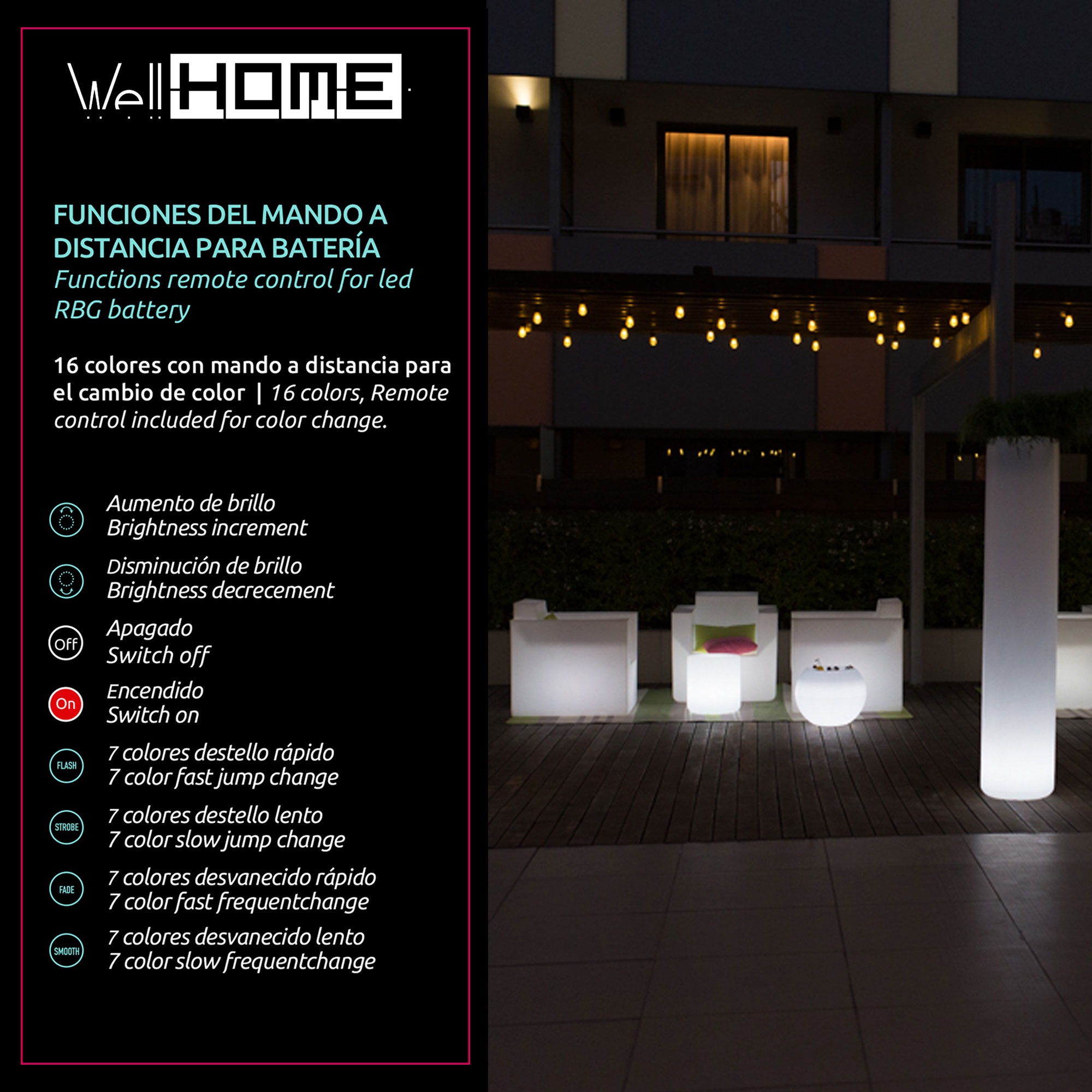 Batería LED RGB recargable, con una duración aproximada de 8h-12h; Voltaje 110V – 220V; 12 bombillas LED; Potencia 2,5W 2200Mah