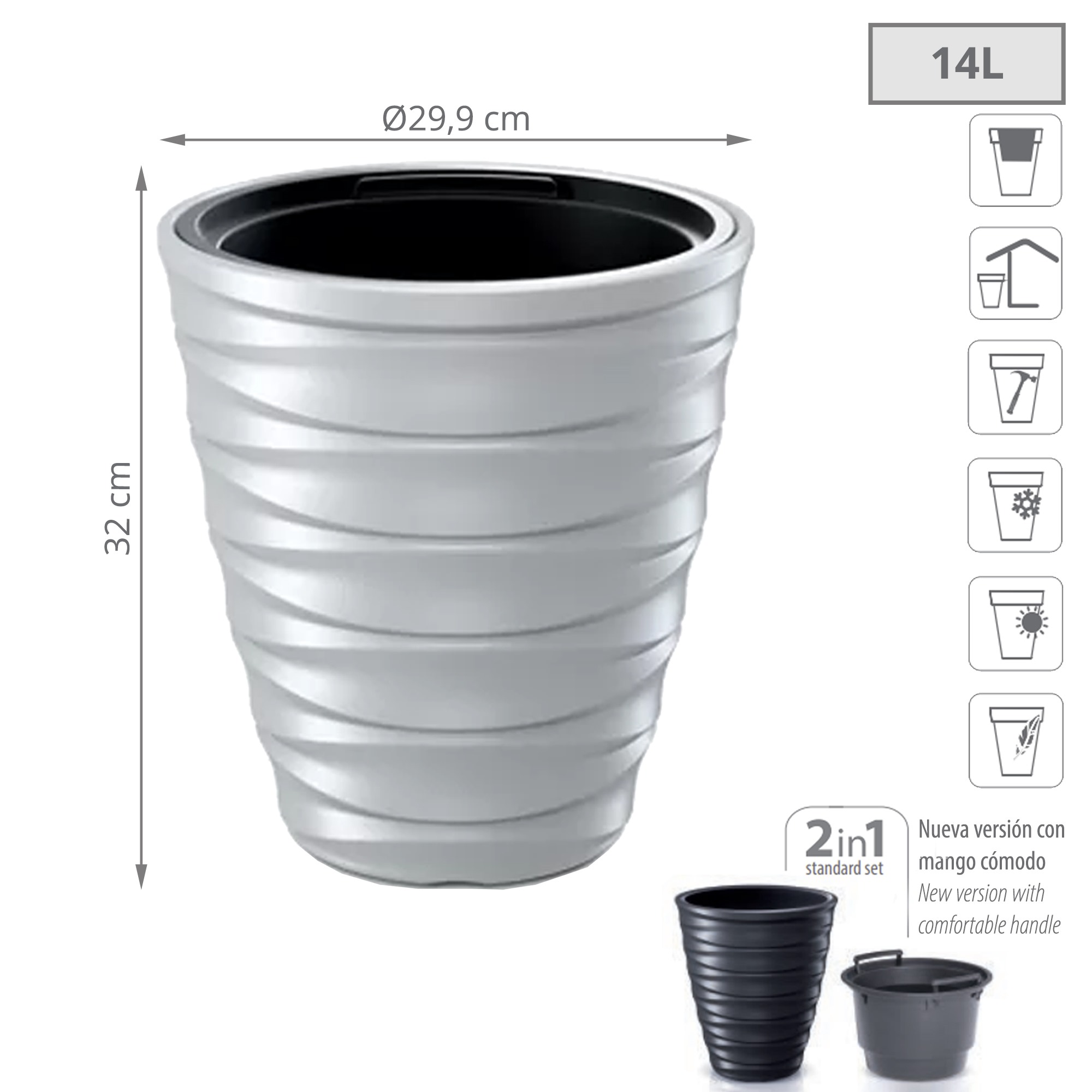 Set 2 en 1: Macetero que incluye un depósito interior adaptado que reduce la cantidad de tierra necesaria.
