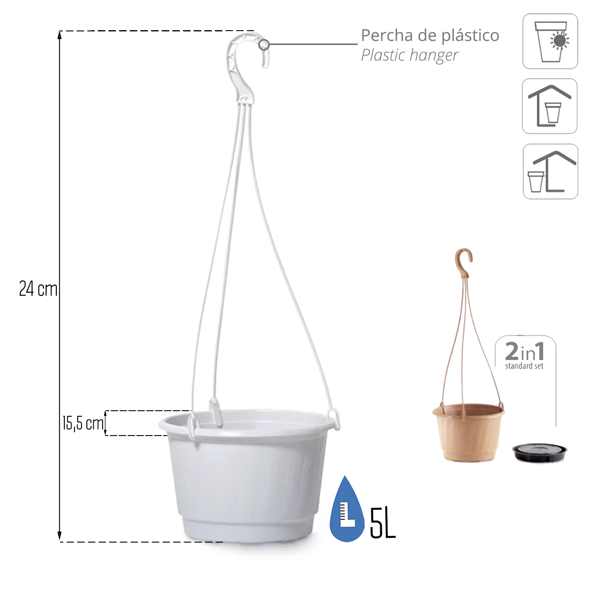 Macetero colgante PRO 5L., dimensiones (mm) 240x240x155, color Blanco