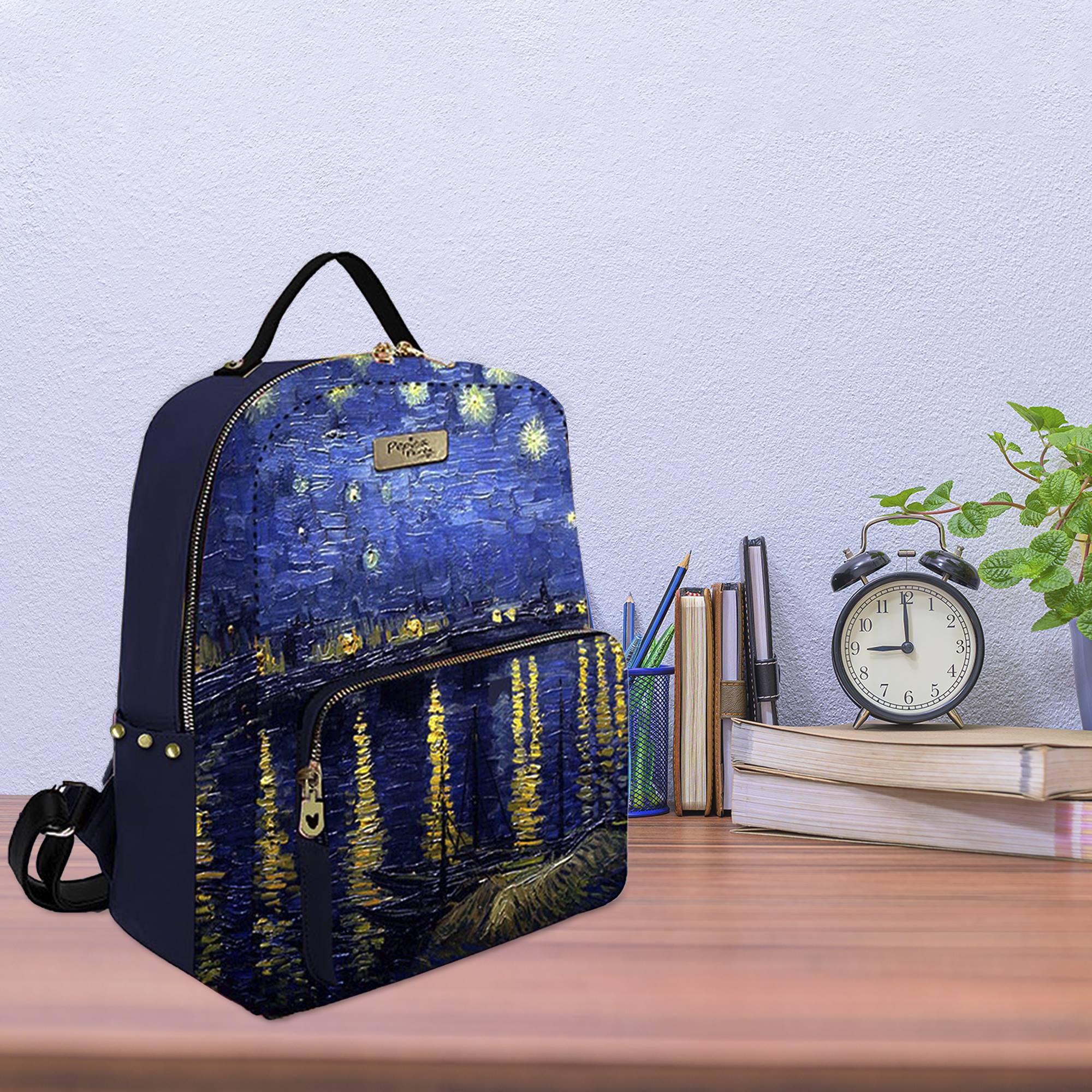 Color azul y en la parte de adelante el diseño del cuadro de Van Gogh.