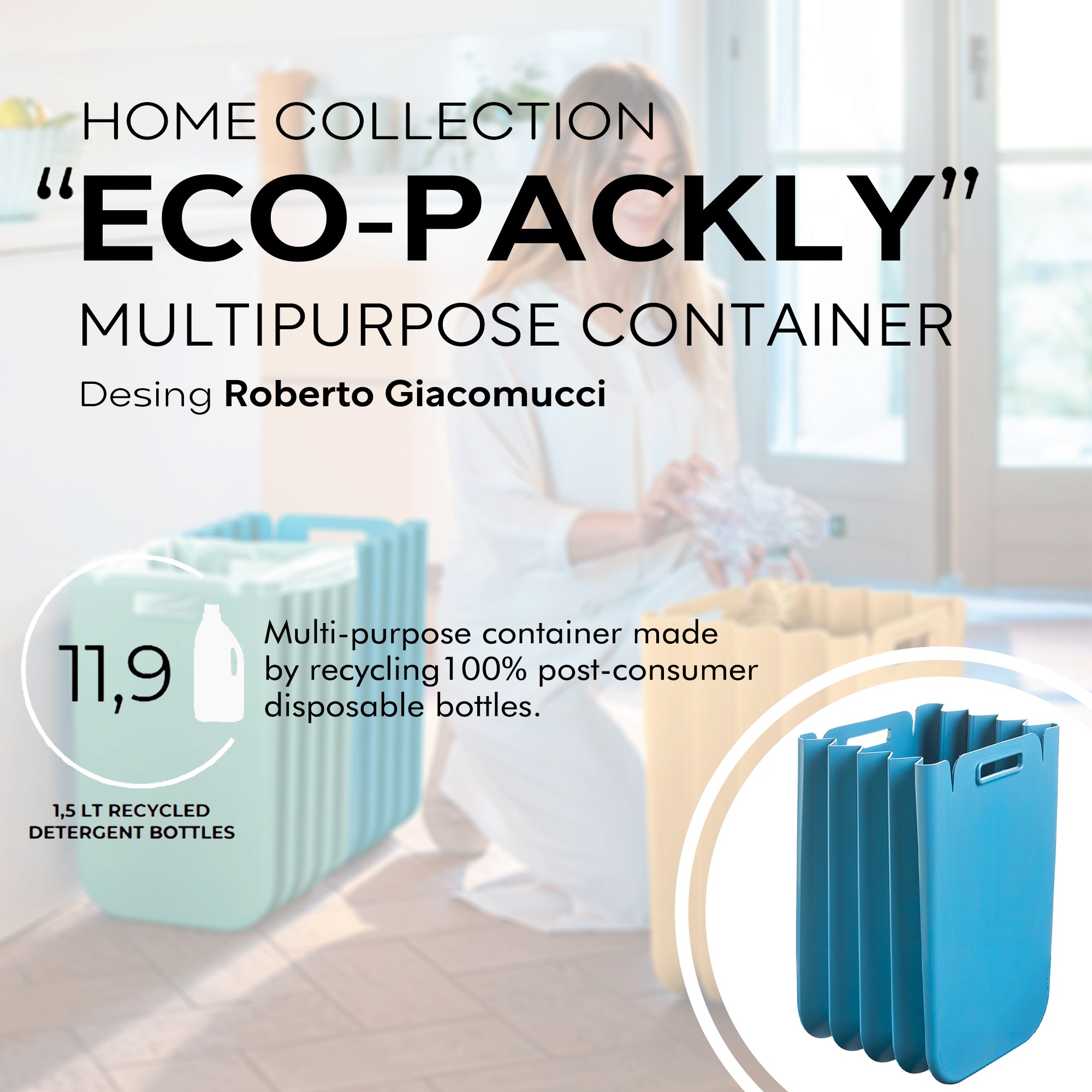 ECO PACKLY: Un innovador contenedor que ahorra espacio gracias a su estructura plegable, de uso polivalente (almacenaje, papelera, cubo de basura, reciclaje…) y apto para cualquier estancia de la casa, además de muy respetuoso con el medio ambiente