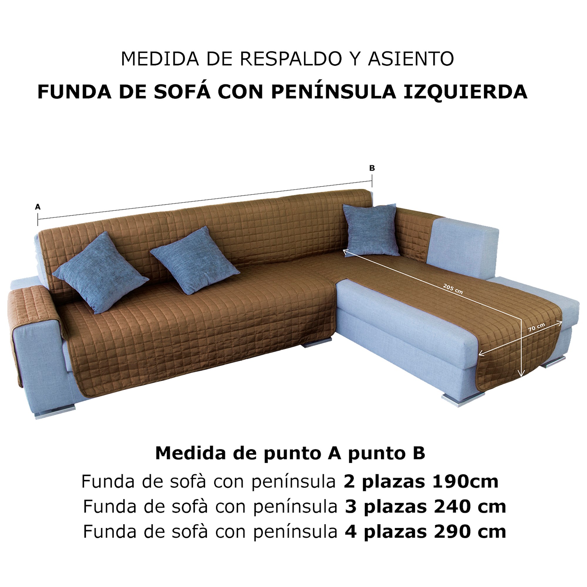 Funda de sofá chaise-longue 4 plazas con respaldo de 290 cm y chaise longue hasta 140 cm (largo) desde el cubre-reposabrazos.
