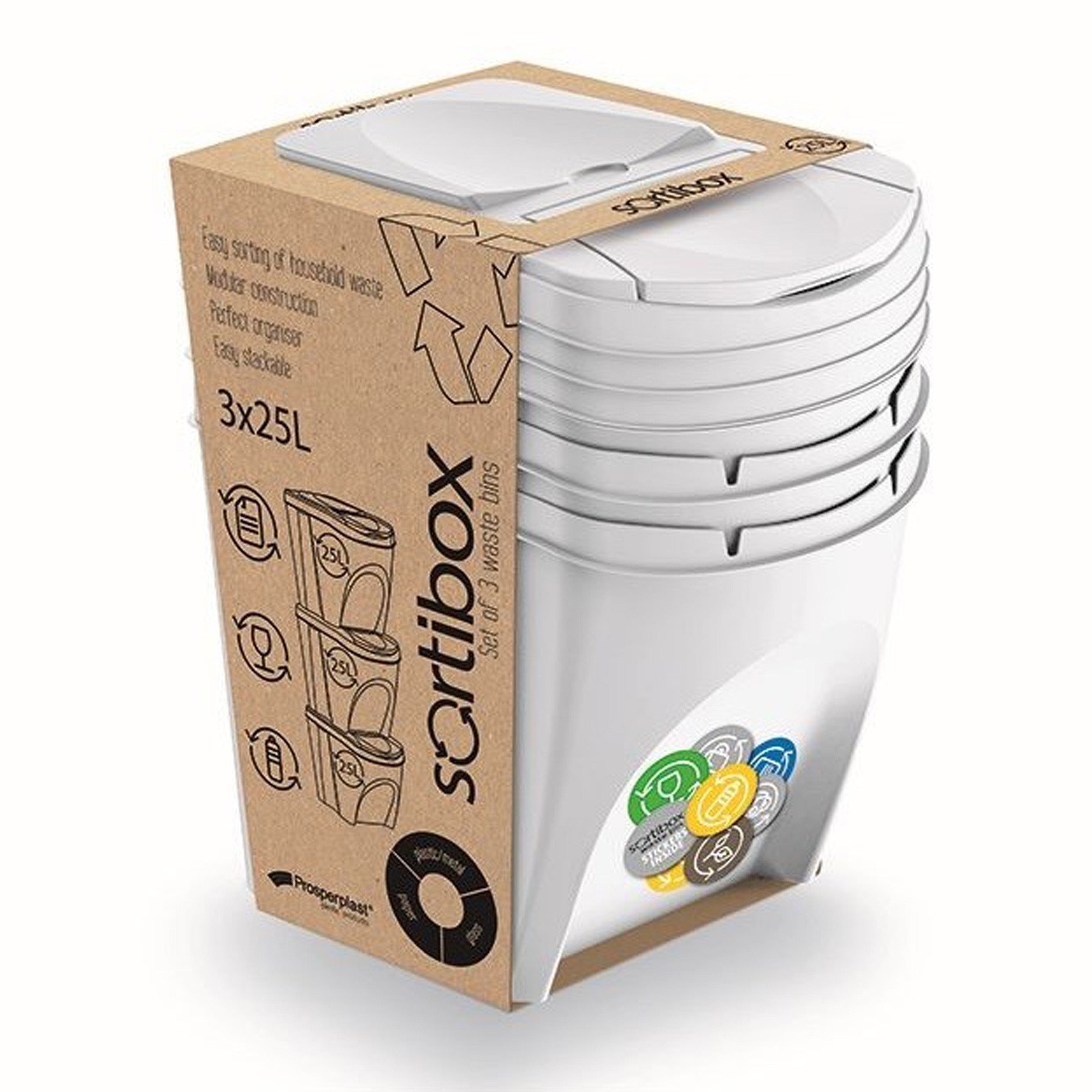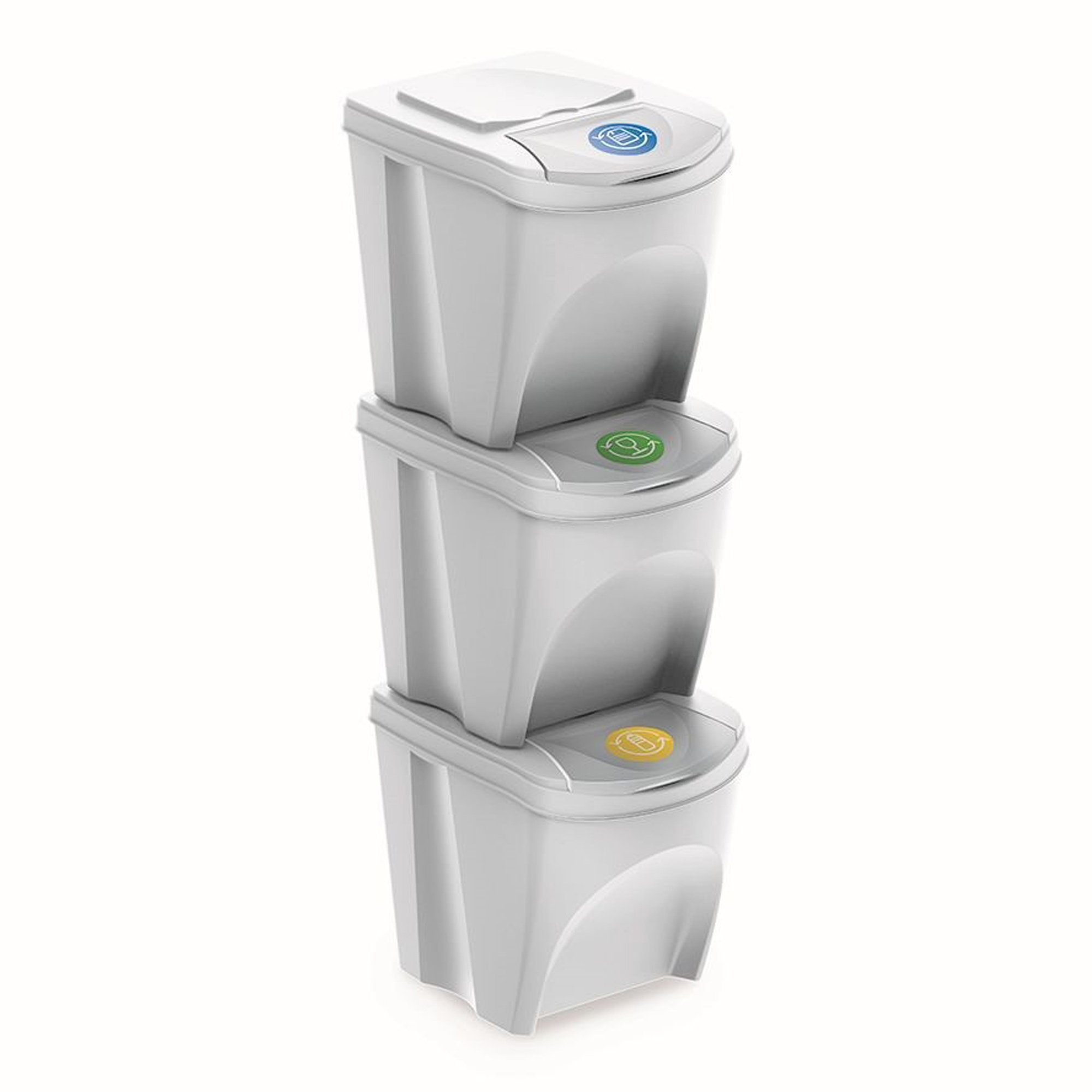 Set de 3 cubos de reciclaje en varios colores de 25 litros cada uno para papel, vidrio y plástico.