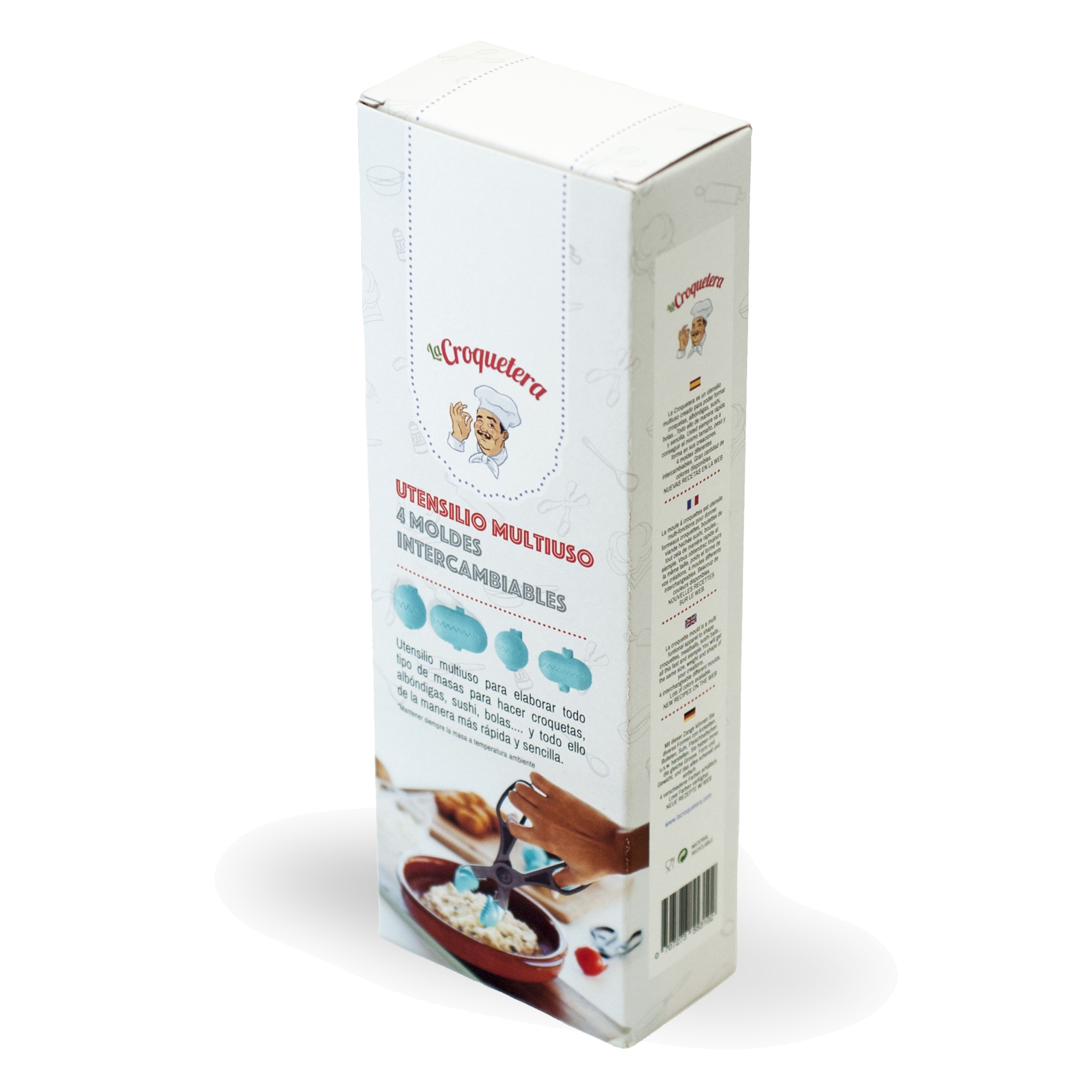 La Croquetera es un utensilio fabricado en España, con patente española, y aparte de su utilidad, se presenta en vivos colores surtidos (pistacho, rosa, rojo, naranja, azul, turquesa, amarillo, morado y verde) .