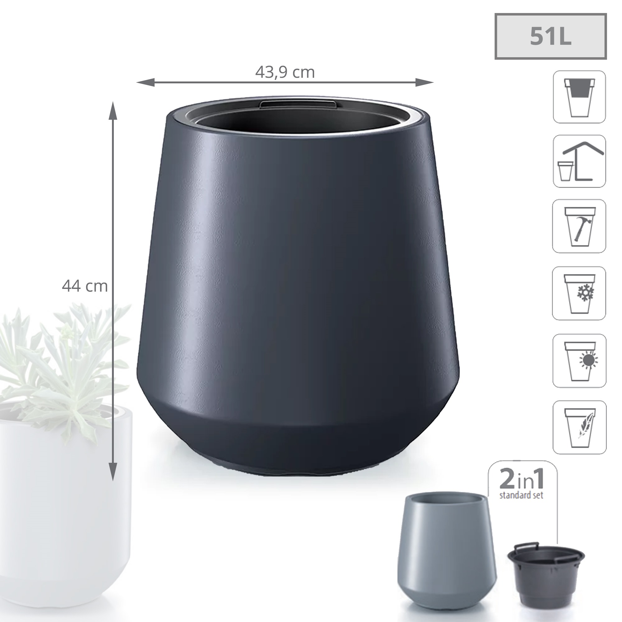 Set 2 en 1: Macetero que incluye un depósito interior adaptado que reduce la cantidad de tierra necesaria.