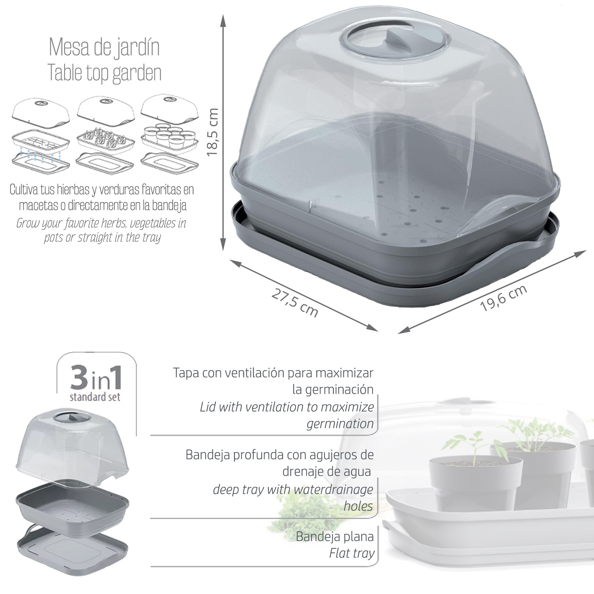 Semillero/bandeja multiusos RESPANA TABLE GREENHOUSE, dimensiones (mm) 257x196x185, color Gris piedra