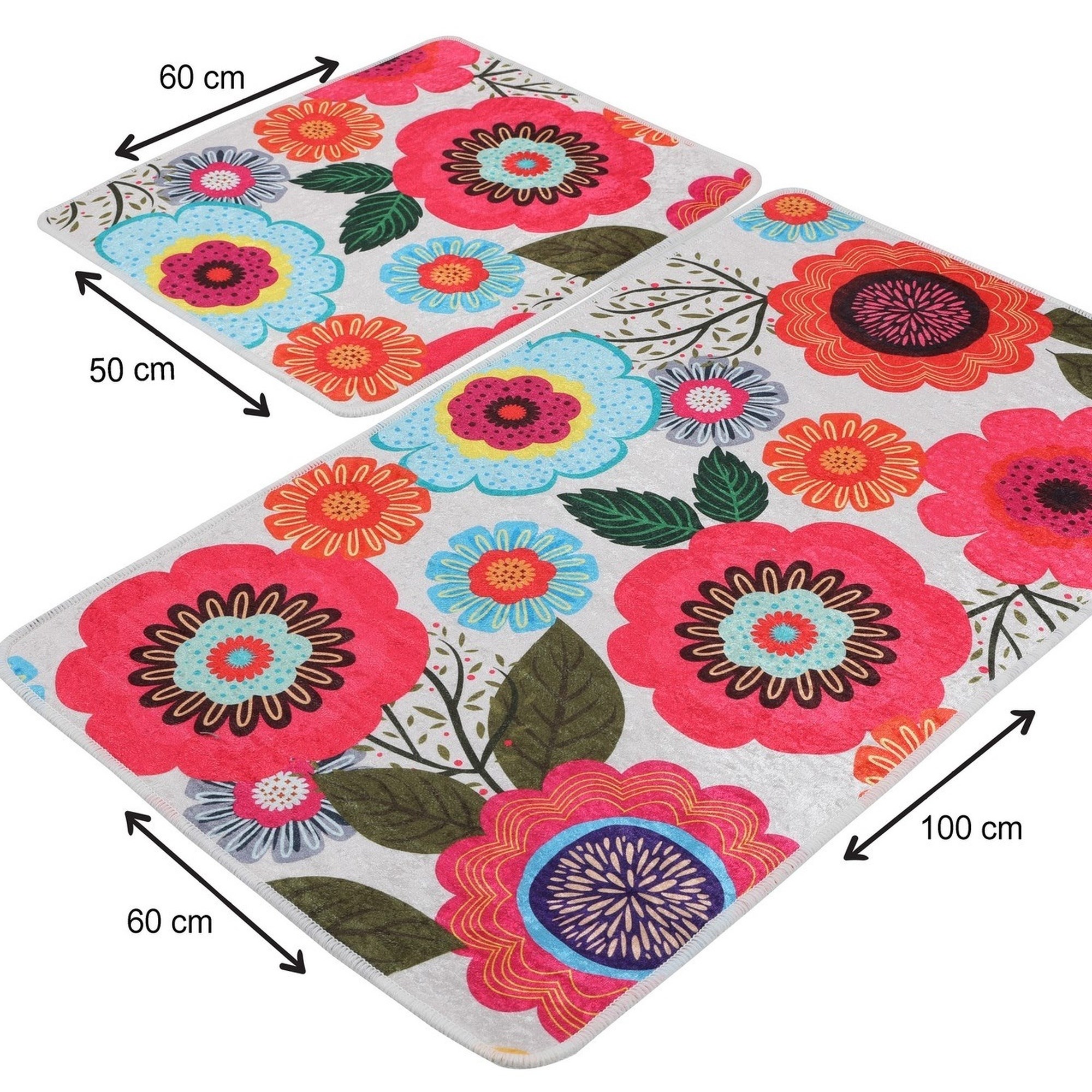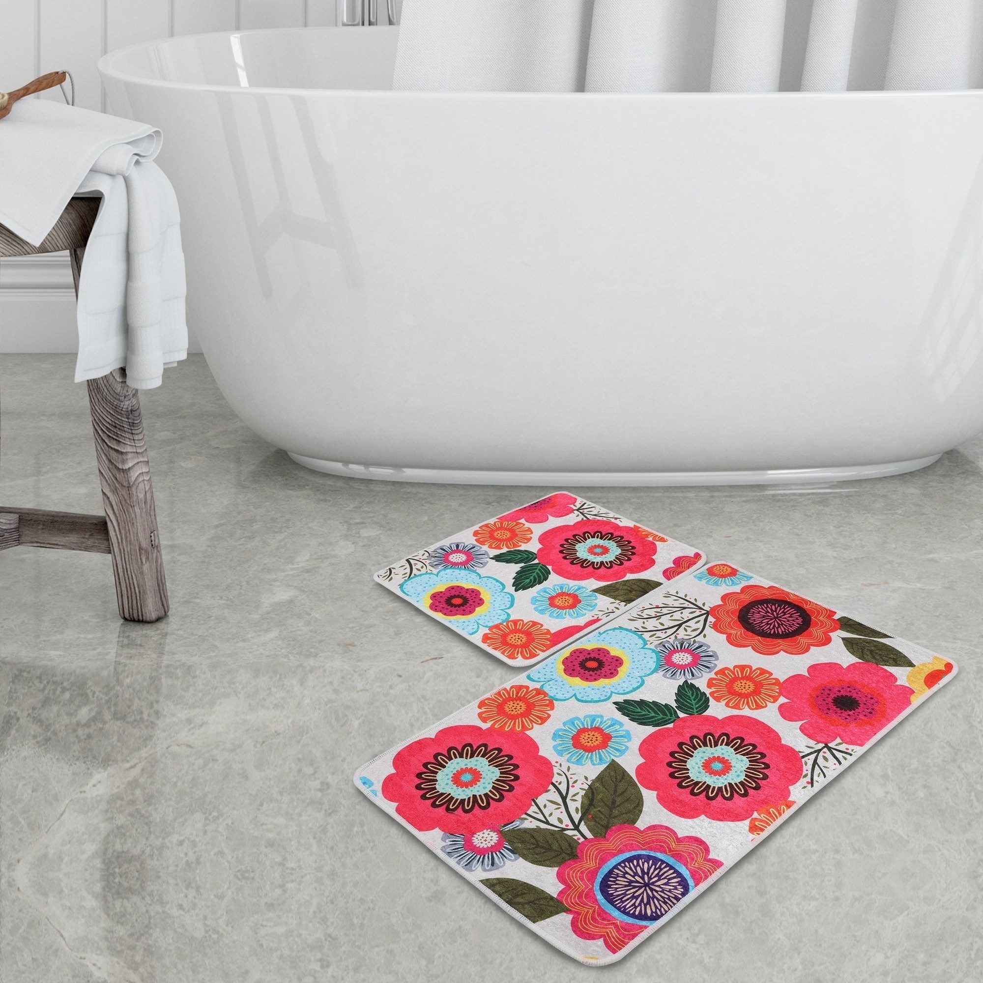 Set de alfombras de baño (2 piezas) flores rosas, azules y naranjas