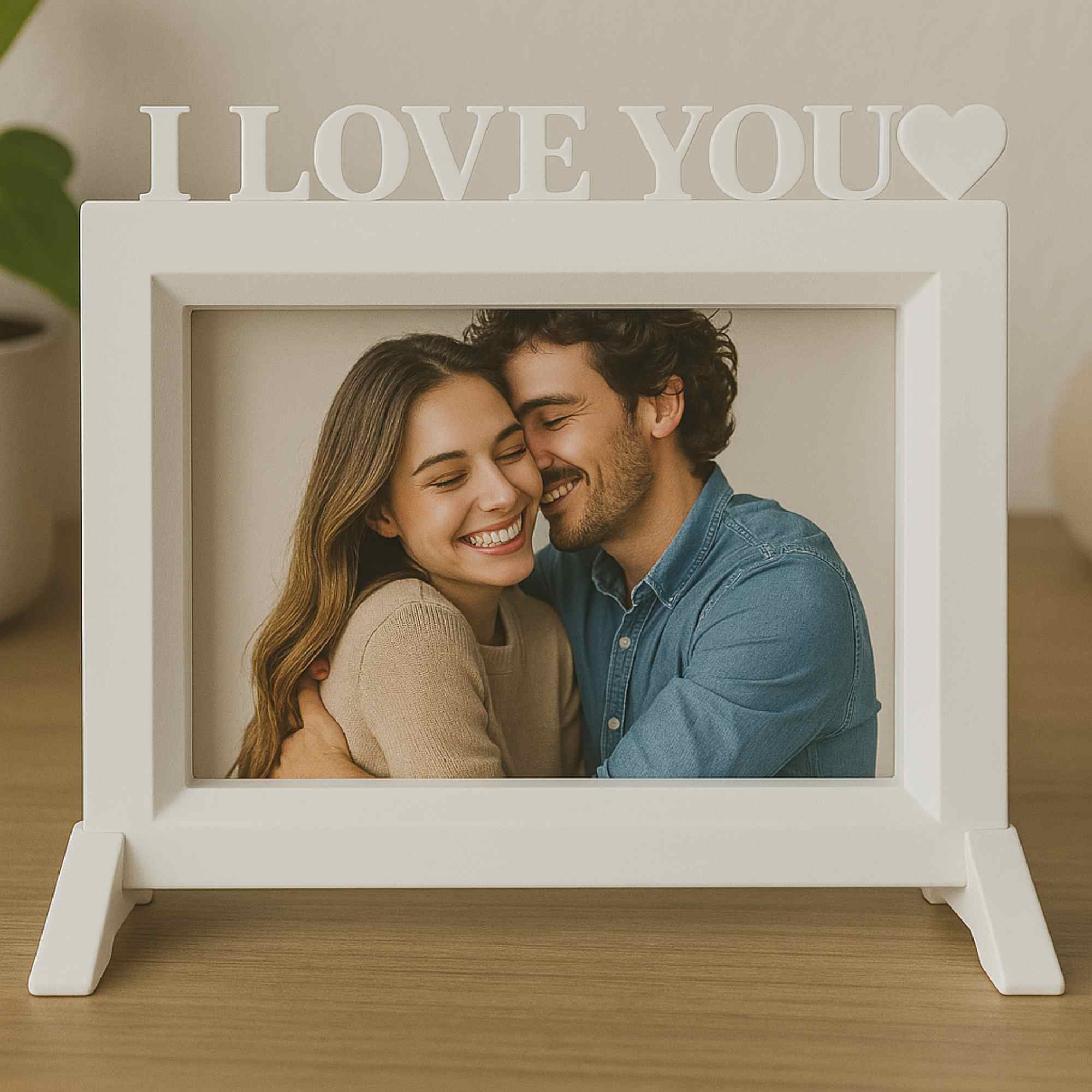 Captura la esencia de tus momentos más especiales con el marco de fotos »I love you», una pieza elegante y versátil que realza tus recuerdos con un estilo moderno y sofisticado.